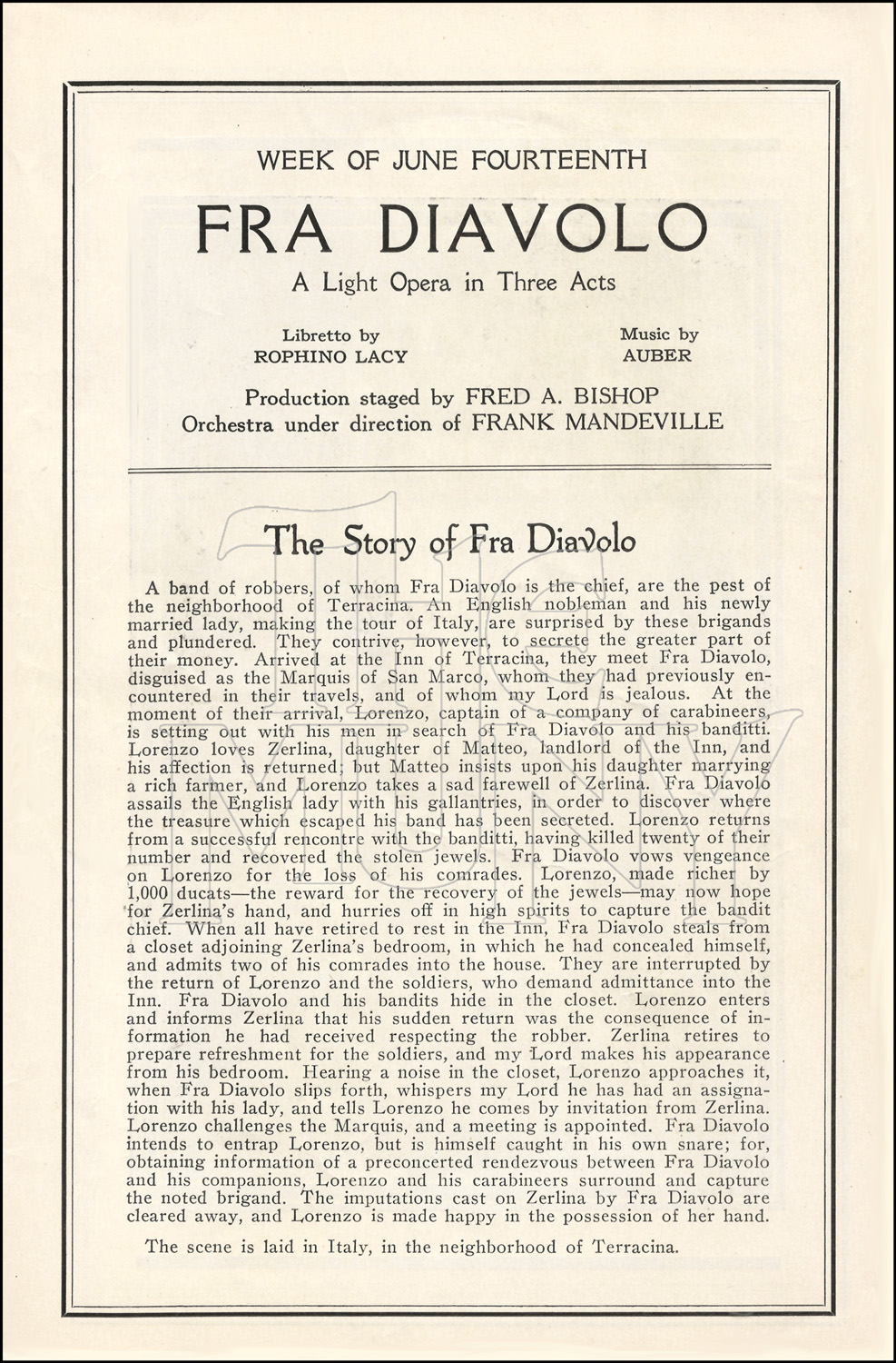 Fra Diavolo, chief of a band of robbers, woos Zerlina to learn where a treasure has been secreted. Zerlina’s sweetheart Lorenzo learns of this, and despite Fra Diavolo’s efforts, the brigand is caught in his own trap. Lorenzo and his carabineers surround the castle and win the day.